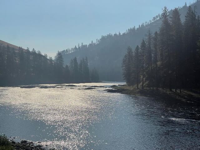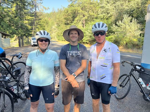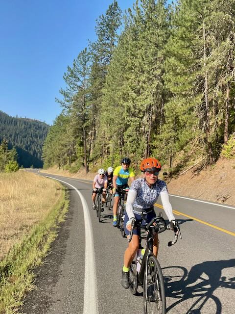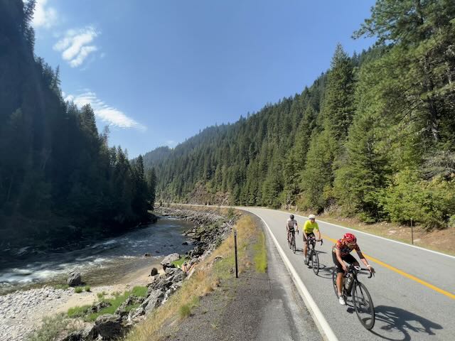 “OK hang a left at the hotel parking lot, climb 106 miles, then coast about 9 and look for the hotel on the left. Oh and the last 6 miles of the climb are the steepest. But really its a gorgeous ride”. With instructions like these is it any wonder that we were more than happy to let guide Megan lead us up the Lochsa River Valley through the Bitterroot range to our entry into the great state of Montana. Although Megan rode yesterday lead guide Blake “let her” take an extra turn up the all day climb. Shrewd Head Guide. Despite our collective apprehension though our sweeper group quickly settled into a good state of mind and a good manageable pace as well. The grade was only one to three percent and fell into the “false flat” category. That is where your senses tell you that the road is flat but one is actually climbing. Before the first rest stop at about mile 20 we had already caught a rider so we had to wave good bye to Megan and carried on. Pat, Paul and I were taking long pulls, enjoying the river, the pine forest and cool morning air. This is why we love riding. All sensory input is pleasant, well except for the occasional logging truck.