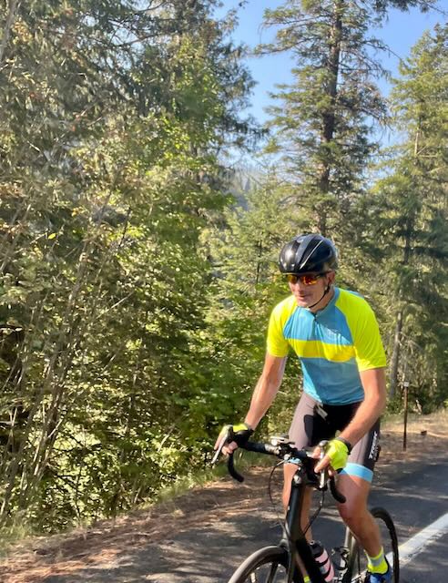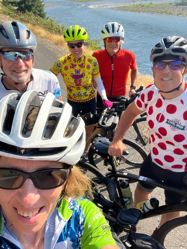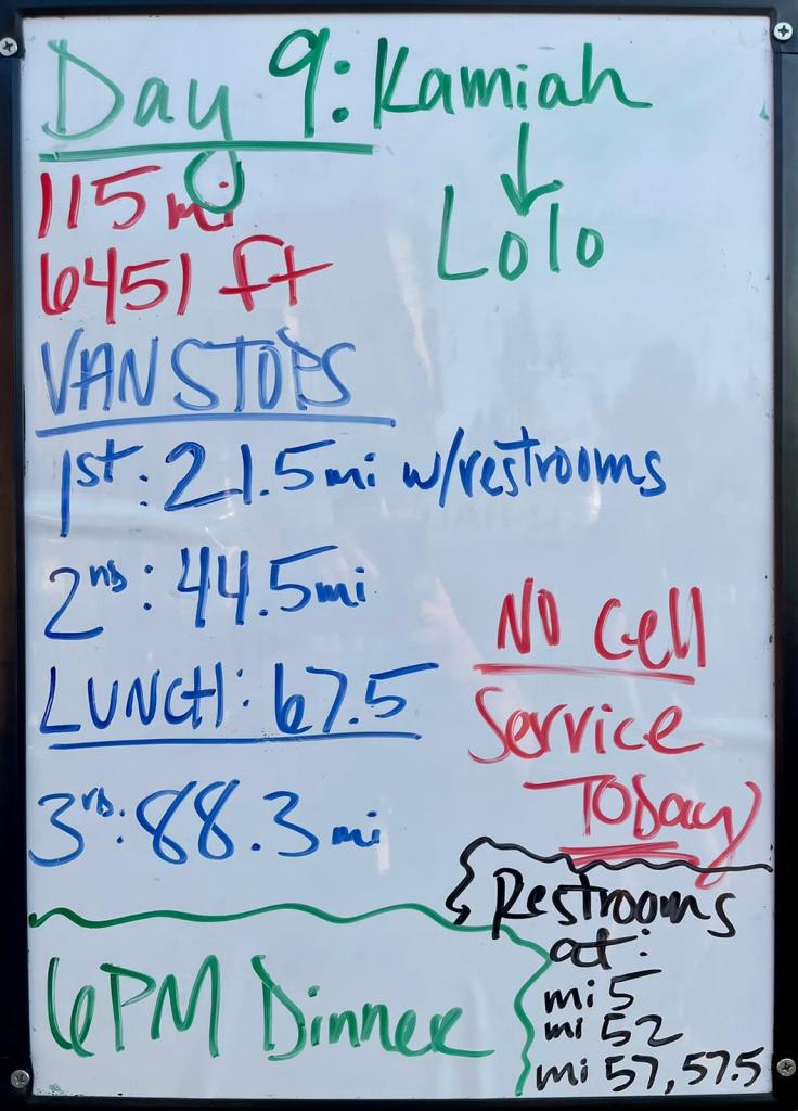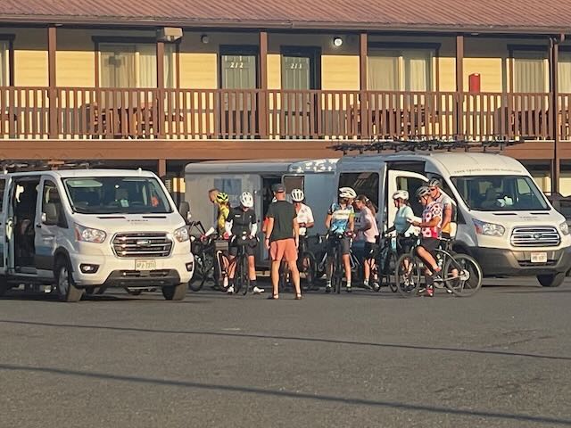 When our intrepid threesome arrived at mile 102, for whatever reason it became racing season. The group was apparently looking ahead to the short ride tomorrow with a rest day to follow and was willing to let it all hang out! First Paul just rode me off his wheel. After complaining about his hamstring all day, I figured he would take it easy but goodbye to me. Shortly after that we swatted down the pesky duo of Mark and Dan, our sultans of humor. Then with about 3 miles to go Jennings flew by me, apparently having gained a second wind or maybe just biding her time? She showed her Olympic courage (She is an actual Olympic medalist after all) and strength. I managed to just barely hang on to her wheel (well I could at least still see her wheel) until we saw the welcome sight of the summit and Guide Brent. After a nice break and a photo session it was a downhill coast to the hotel. Or was it. Mark took a very fast lead until Jennings flew by the both of us followed by Paul who gapped everybody. With only a mile to go my thoughts were turning to chocolate milk and perhaps a cold beer when Jennings partner Silk grinded by us. What the heck! We jumped on his wheel and caught Paul after the first entrance but before the second entrance leaving the identity of the winner appropriately nebulous. With the road strength of this group, God help me come week 4!