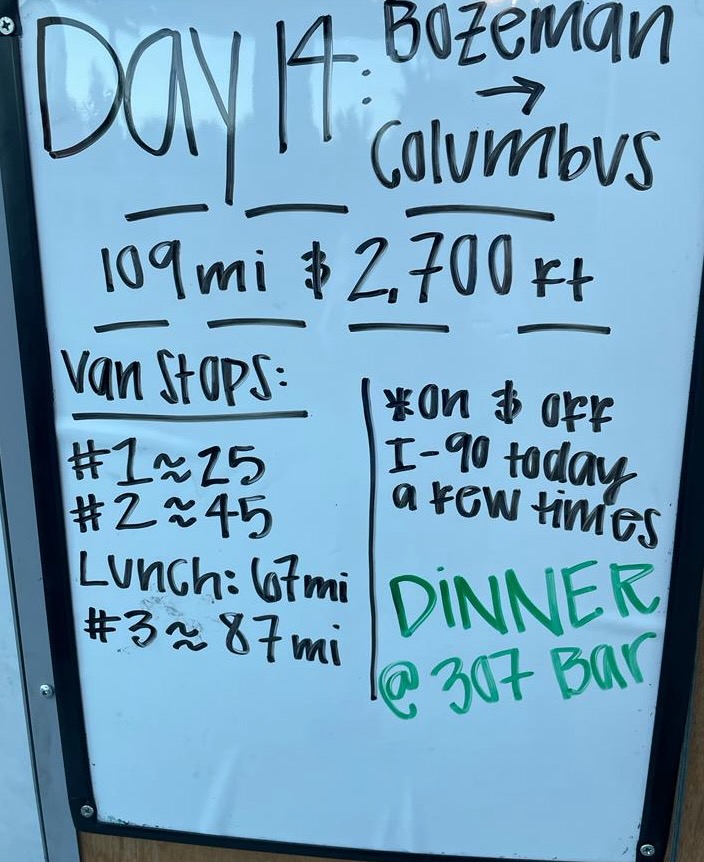 Weather, as is the trend, was very hot (high 90s) by the end. Columbus MT does not have much to offer in the way of lodging, but the Super 8 did offer soft beds and AC. I could have done without the cigarette smoke infused carpet and drapes though. The Inn was full so not a lot of other room options available for my daughter and I. Yes you read that correctly, Taylor cajoled a friend to drive her from Billings and drop her and at the hotel for our ride tomorrow. Excited to have her join us!