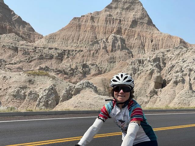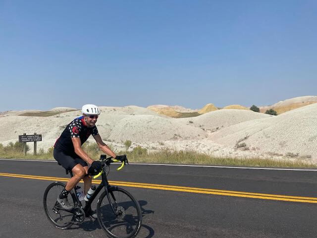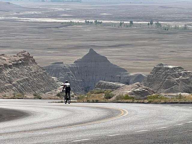 After lunch, a ten mile ride brought us to Badlands National Park . The fantastic views and rock formations distracted us for a while from the heat. My description and the photos do not do it justice. I would like to return for an early morning cycle through the park as the light would make the formations stand out even more impressively.