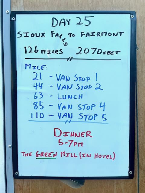Overall a good day and everyone was on the bike at least for some of the ride as recovery continues for those afflicted by the gastrointestinal virus. I had thought it would be devastating to complete every mile, (EFI) but how many people will ride over 3000 miles in their lifetime, much less in seven weeks? This is still a very worthy accomplishment. Tomorrow an easier day with a later start.