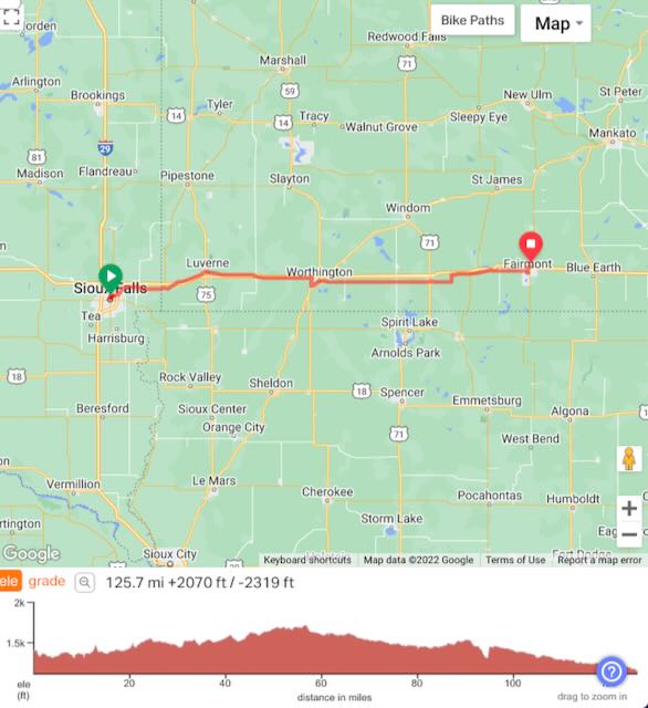 Another LOONG day in the saddle. However the weather was cool, the winds were cross tailwinds for the most part and the Paceline was efficient. We arrived in state number seven in a state of happy exhaustion. I have never had the pleasure of visiting Minnesota. So far my impressions are very favorable. The roads are very good, the drivers are extremely courteous and the farms are well tended. Lots of corn so far as we just missed the corner of Iowa so the climate must be very similar.