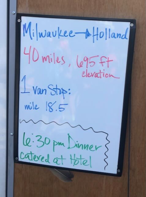 A much different day today. First I had to say good bye to Susan, Michael and Elle as they loaded up and headed back to Chicago via the Cheese Castle. We had a very late start for our three mile ride to our Speedy Ferry that would take us across Lake Michigan in about three hours. This was a great time to catch up, enjoy the scenery and catch a quick nap . Once we embarked, we were met by Megan and the Lunch Van for a quick snack before heading southeast to Holland. We of course had a late start to meet the Ferry and lost an hour with the crossing into our ninth state, Michigan.